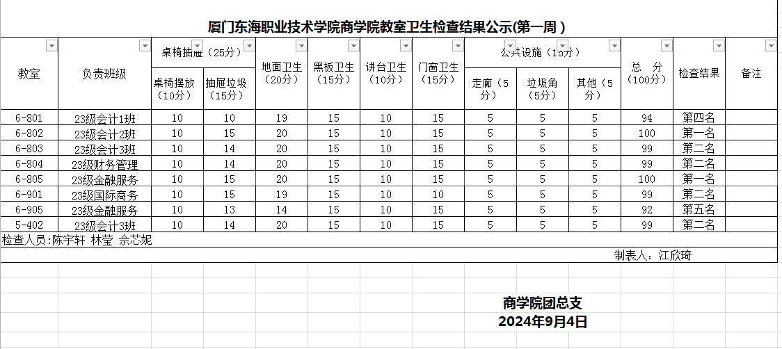 2024-2025学年第一学期商学院第1周班级卫生评比