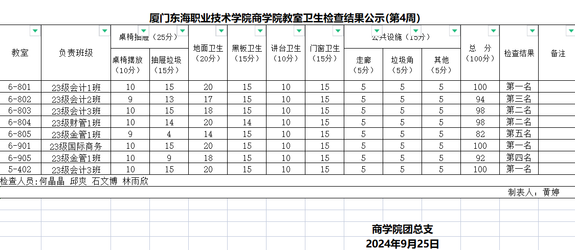 2024-2025学年第一学期商学院第4周班级卫生评比