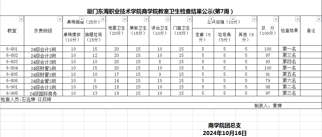 2024-2025学年第一学期商学院第7周班级卫生评比