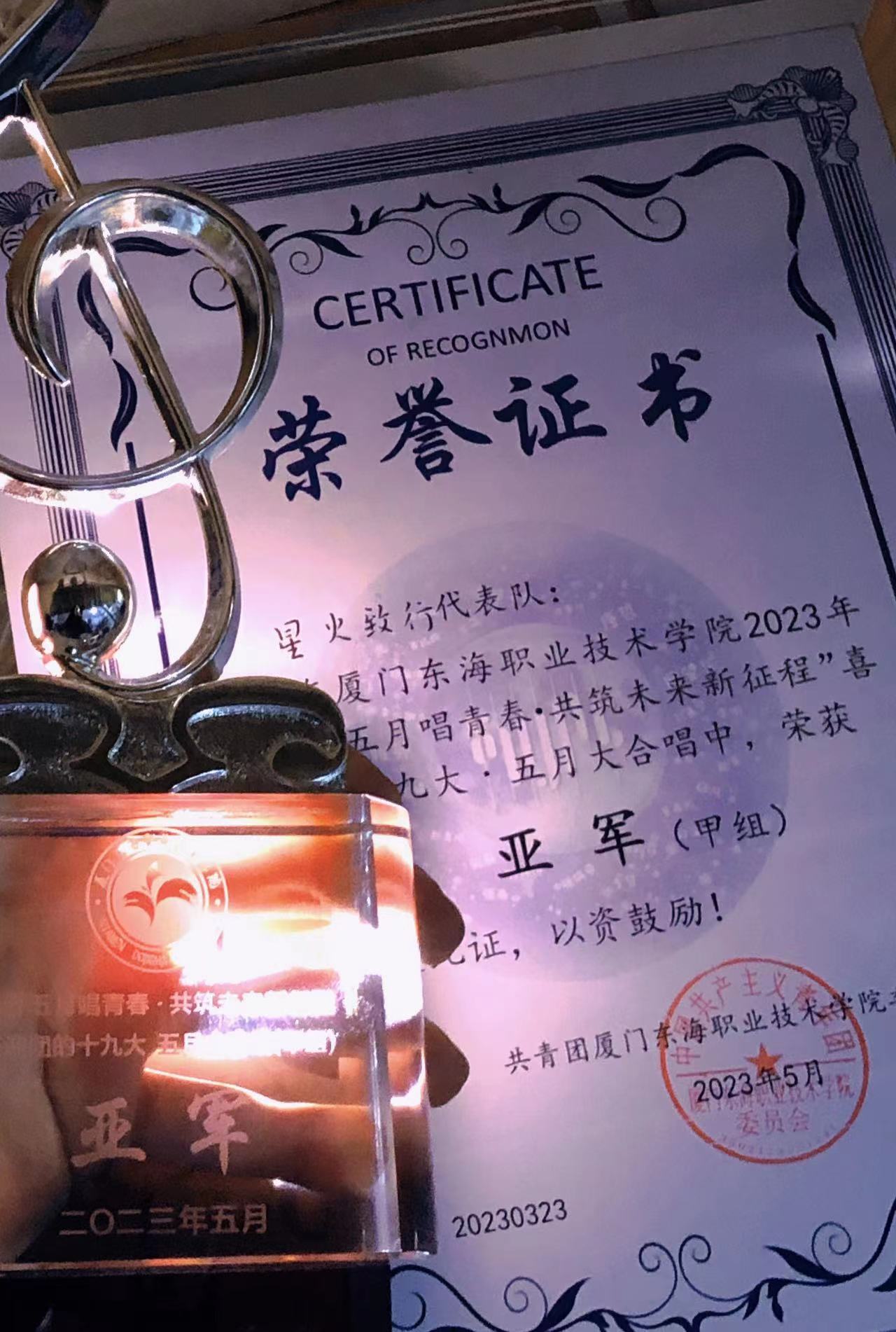 2023年5月29日信息工程学院星火致行代表队参加校“花开五月唱青春 共筑未来新征程”喜迎团的十九大.五月大合唱比赛。我院代表队演唱曲目为《星辰大海》在比赛中同学们精神抖擞、神采飞扬,在歌声里重现百年的岁月峥嵘,展现我们对祖国的热爱以及青年的朝气。最终经过激烈的角逐,我院获得此次大合唱比赛的亚军。