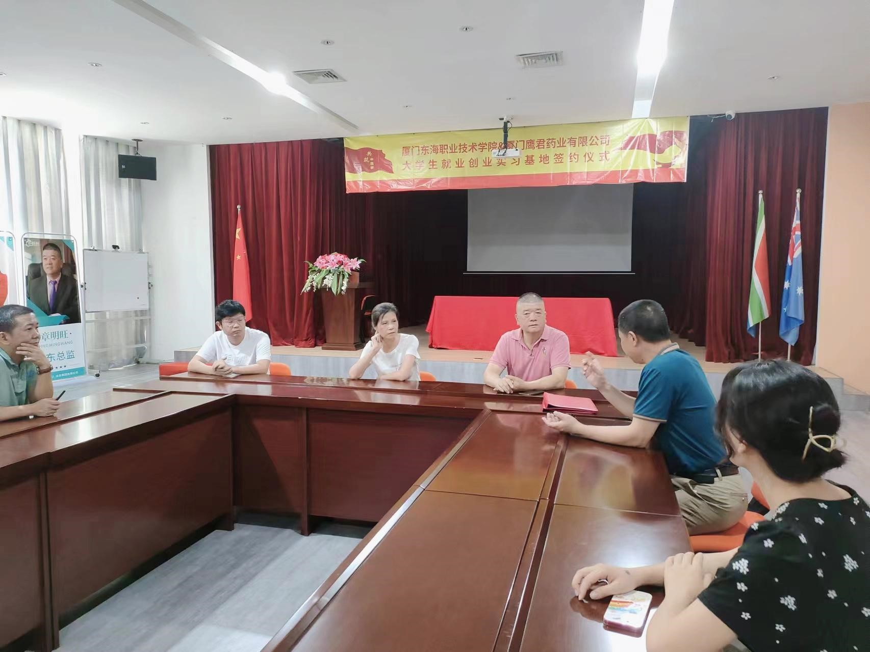 考察交流会上,企业董事长章明旺先生、总经理陈林香女士陪同张清禄院长一行先后考察了公司的生产经营情况和企业的产品展厅。双方就学校向企业输送毕业生,安排学生到企业实习,建立大学生创新就业实习基地等事项进行了深入细致的交流,并签订了厦门东海职业技术学院与厦门鹰君药业有限公司共建“大学生创新就业实习基地”协议书。