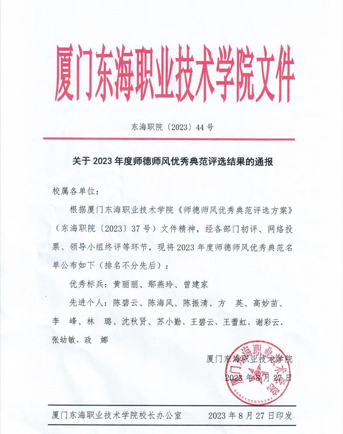 添加时间:2023-08-30根据学校《师德师风优秀典范评选方案》的相关精神,经过学院推荐和学校评审,我院陈碧云、政娜两位老师荣获厦门东海职业技术学院师德师风先进个人荣誉称号。二位教师长期奋战在学院教学和管理第一线,践行“爱岗敬业、爱生如子、爱校如家”的“三爱”精神,成绩突出,获得领导、老师和同学们的一致赞誉。