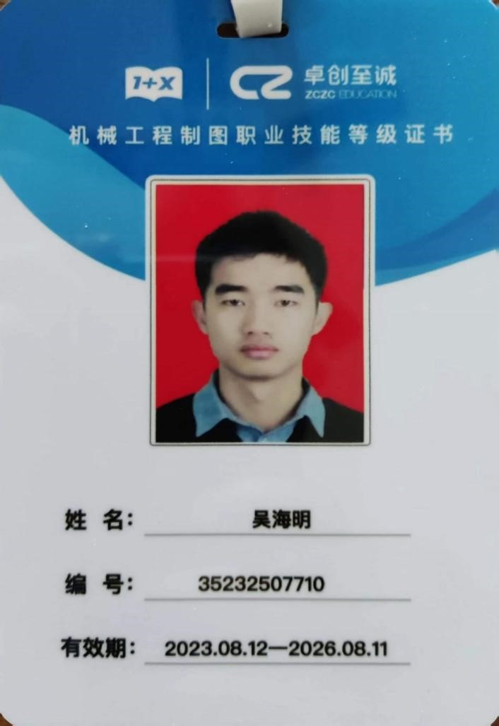 为贯彻落实1+X证书制度试点方案,加强教师队伍建设,2023年8月7日-8月12日,吴海明老师参加由北京卓创至诚技术有限公司主办、石家庄职业技术学院承办的机械工程制图职业技能等级证书师资培训。本次培训内容丰富全面,不仅使吴海明老师自身的业务能力得到了快速提升,同时顺利通过考核,取得了机械制图考官证书,为我校1+X机械制图考评工作的顺利开展提供了技术保障。