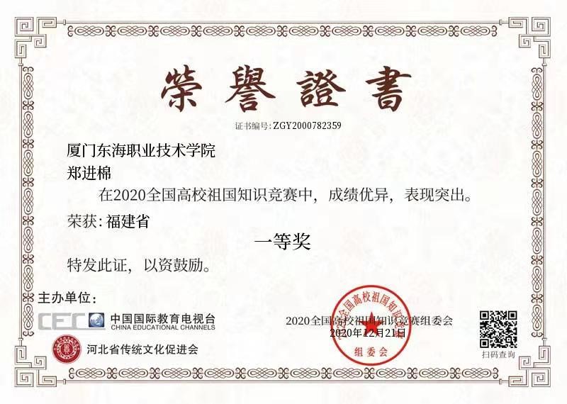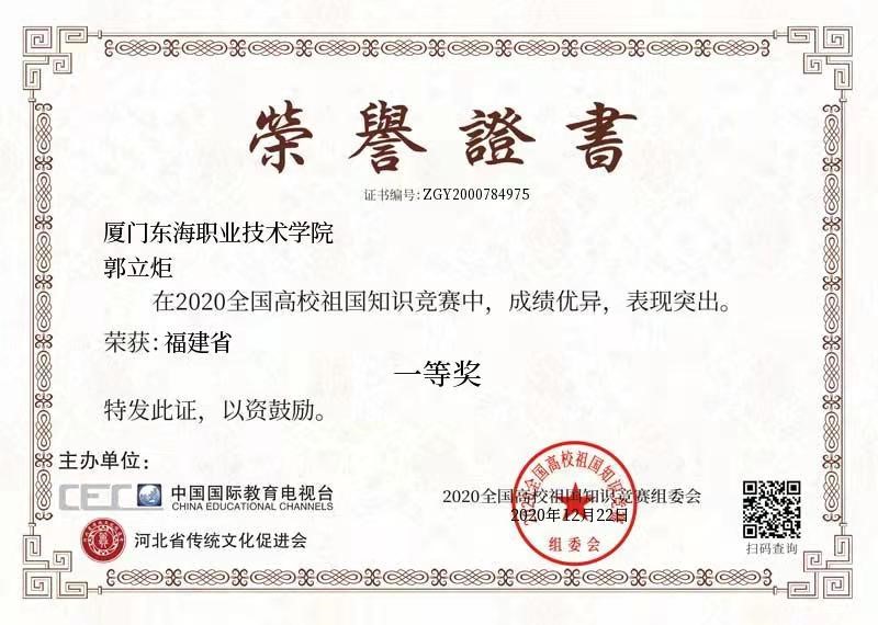 为贯彻落实好习总书记的指示精神,强化大学生爱国主义教育,筑牢青年学生的爱国之基,2020年10月07日,由中国国际教育电视台、河北省传统文化促进会主办,网易有道以及全国各大高校及学生社团协办的“全国高校祖国知识竞赛”活动中,我院软件技术二班何江塬、鲁文杰、郭立炬、郑进棉等四位同学在此次“知识竞赛”中,均获得了福建省一等奖的优异成绩。