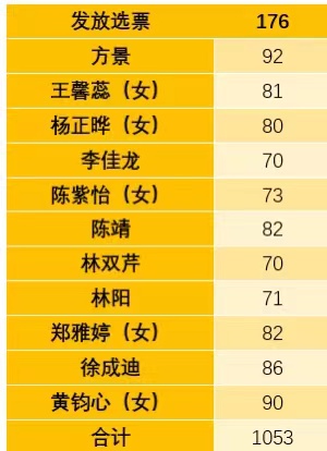 随着同学们的竞选演讲的结束,各位代表们投下庄严的一票,选票结果附下。活动的结束标志着新一届团总支委员的诞生,新的序幕拉开,新的故事开始。